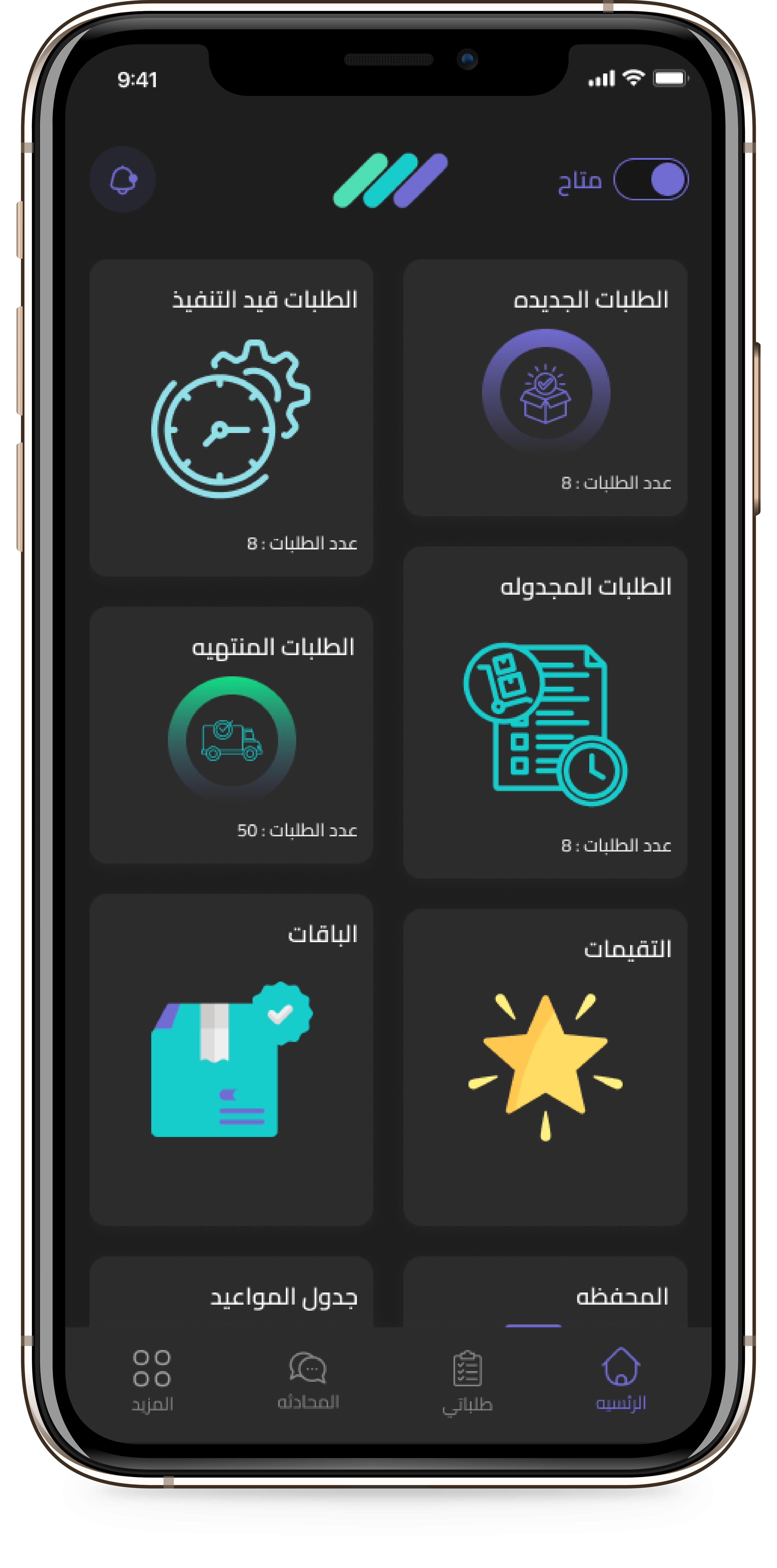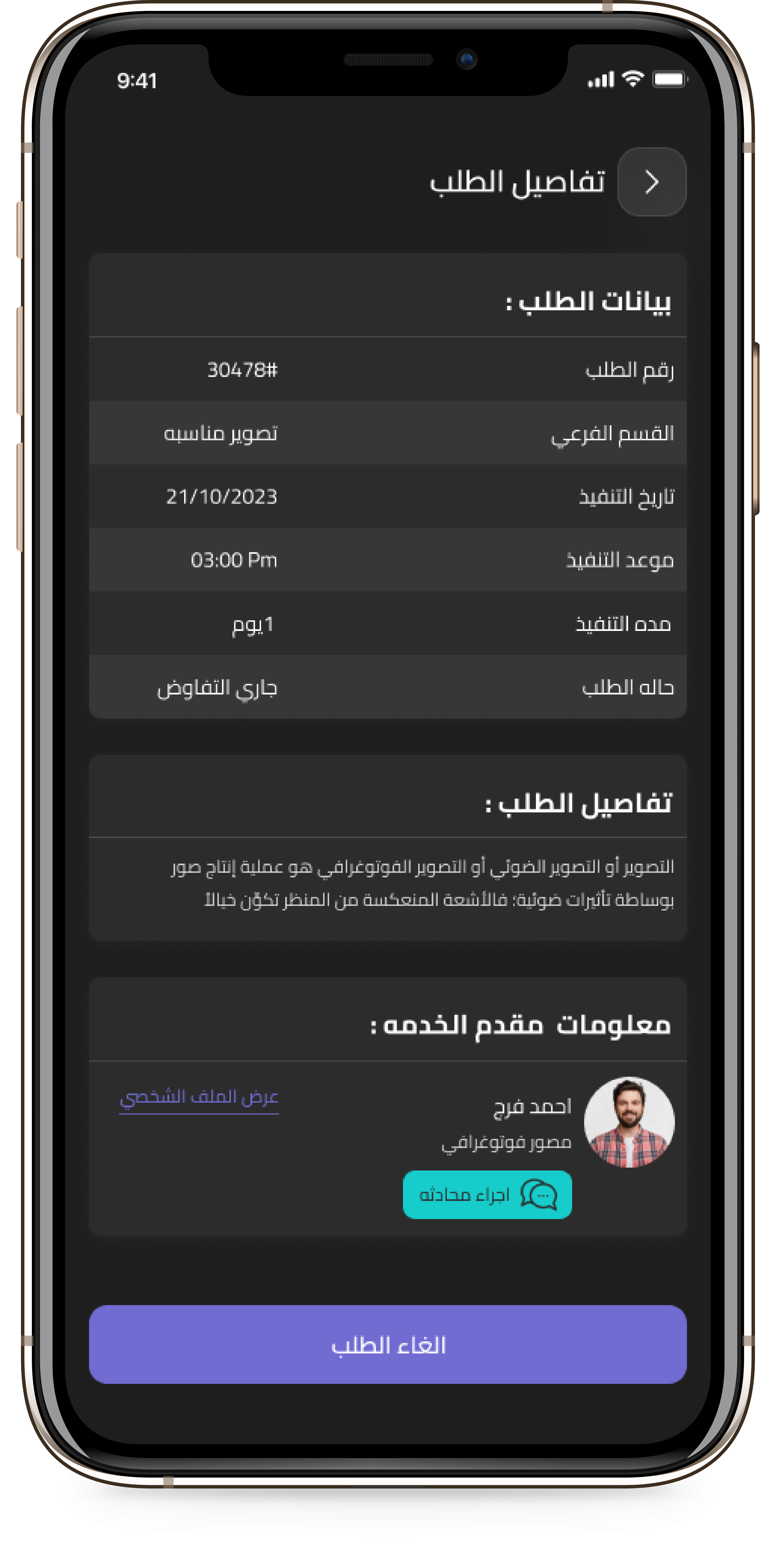 يمكن للعملاء متابعة حالة طلباتهم والتواصل مع مقدمي الخدمة وإدارة التفاصيل الخاصة بالمشروع من خلال التطبيق.